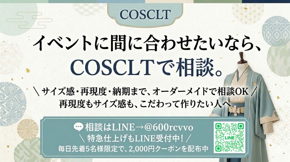 既製品では叶えにくい“理想の一着”を、COSCLTがかたちにします。参考画像やご予算に合わせて、再現度・着心地・シルエットまで丁寧に調整。無料見積もり&1着から相談できるので、はじめてのオーダーメイドでも安心です。
